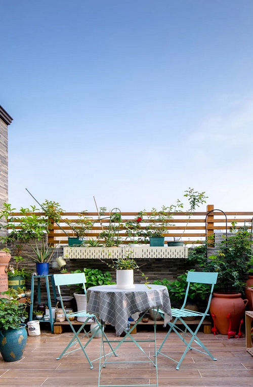 摆上户外桌椅,就可以打造一个简单的会客区,在这里和朋友聊天,空间开阔。当然,如果怕热,可以加遮阳棚。