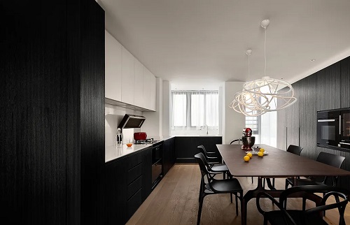 餐厅与厨房置于同一个空间里,转身就是餐桌,传菜动线几乎可忽略不计,而且,这种设计还可以提高空间利用率。