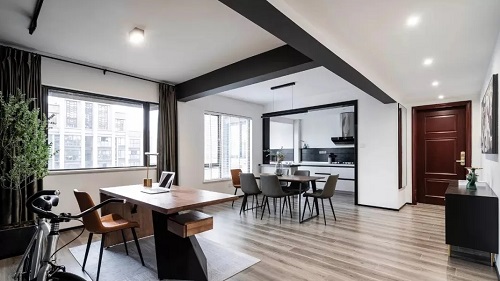 还有一种以不变应万变的方式,就是直接裸露横梁,呈现粗犷建筑肌理。直接裸露横梁,不失为一种打破常规的设计方法,非常适合工业风的设计。不过,裸露横梁也是有小心机的,你以为是保留原始的横梁,但实际上,可能是加入了水泥装饰,比如微水泥材质。