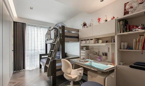 幼儿园阶段,一张小书桌就可以满足涂涂画画、做手工、拼图、控笔训练等多种需求。这时,更多是培养孩子的专注力和兴趣爱好。等孩子上小学开始写作业了,就需要更适合的书桌椅,并营造一个更安静专注的学习空间。有条件的,还可以留出一个独立书房。定制书桌满足二孩的学习需求,左侧柜子可用于衣物收纳,右侧则是一个开放式书架。