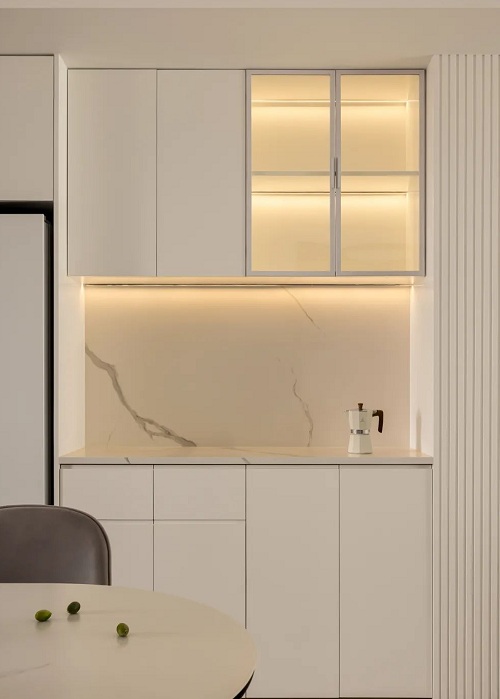 除了墙体,灯线还可以嵌入柜体层板下方。不过嵌入柜体美观不是第一要义,更重要的是可以减少柜内照明死角,使用更方便。注意,买灯线的时候不要贪便宜,不然很容易出现一半不亮的情况,更换就麻烦了。