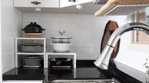 水槽下方的空间,因为有下水管的原因,空间不好利用,这可以考虑使用活动伸缩置物架,用来收纳各种清洁用品,个人不建议收纳锅具,毕竟水槽下方的空间比较潮湿。
