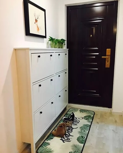 玄关是进门之后的第一个空间,为了留下好印象,这里的收纳一定要做好。建议定制一个最大体量的鞋柜,用来收纳未来你数不清的鞋子。为了方便,鞋柜底部留空,常穿的鞋子或者拖鞋放在里面,其他鞋子全部放鞋柜,这样进门不见鞋,你家会给客人留下很好的印象。