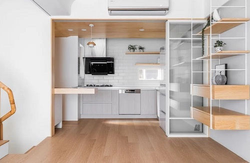 与老人同住的情况下,厨房一定要大,还要有互动性,这样不管是一起做饭,还是兼顾小孩都能得到满足。小厨房可将餐厅扩入或设计成开放式,大厨房可在厨房设计岛台或吧台来完善功能。客餐厅与厨房的互动性增强,动线得以优化,就算大人做饭也能实时关注小孩的动向。不能做开放式厨房的地区,可设计成半开放式,玻璃门拉开是开放式,关闭是封闭式。