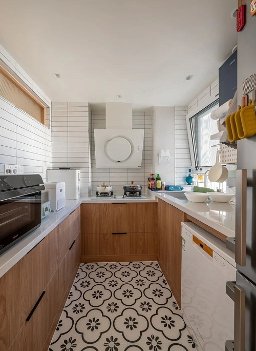 地铁砖可以和花砖搭配使用,简单图案+丰富图案,这样就不会显得那么单调,对比强烈,更加平衡,地铁砖更适合工字铺。地铁砖本身是长条形,所以在视觉上有一种拉伸效果,如果是竖贴可以拉伸层高,如果是横贴,就让空间显得更宽敞。