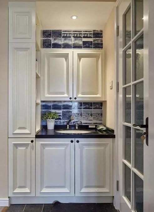 如果你家的卫生间面积足够大,那可以直接采用定制高柜的设计来增加储物空间。这个设计的前提就是空间一定要足够大,而且干湿分离已经设计好的。定制高柜还能直接设计在洗手台上面,这样更便于收纳化妆品。