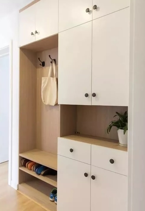 鞋柜尽量做成顶天立地设计,下层收纳鞋子,上层收纳杂物。